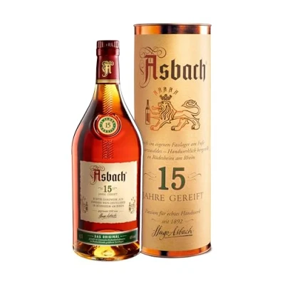 Deep orange, on the nose the Asbach 15 is sweet with hints of fresh pear, apple, orange and long lasting floral notes Asbach 15 years old is fascinating due to the way it perfectly balances elegance and exquisite harmony with the full-bodied aroma and characteristic strength of particularly old distillates. Ideal after dinner with Chocolate or full flavoured cheese. 40 % abv Packaging May Vary