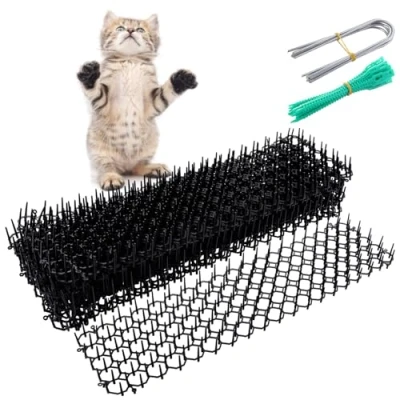 PREMIUM QUALITY MATERIAL: This cat deterrent is made of high quality polypropylene plastic PP which is durable and can be used indoors or outdoors. The cat repellent mat is also very flexible and can bend freely PROTECTIVE FEATURES: Our anti-climbing safety spikes will gently scare or irritate animals from approaching the area you want to protect, for example stopping cats from pooing in your garden SAFE TO USE: The cat proof spikes on the cat mat will irritate the animal's paws and feet, causing discomfort when scratching or digging, but will not harm the animal's skin or paws EASY TO USE: This barbed wire can be configured to the size and length you want, and can be lengthened or widened by means of U-shaped pegs. Designed for 12 cat scratching mats 13cm x 49cm, including 12 stingers , 12 spikes , 30 cable ties PLACES OF APPLICATION: Animal repellent mats are suitable for indoor and outdoor use as well as for any valuables you want to protect, such as lawns, flower beds, gardens, furniture upholstery, vegetable patches, cars, windows, wardrobes, sofas, etc