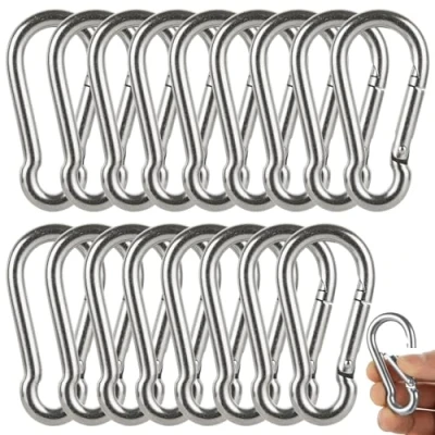 Quantity and size :304 stainless steel clip, length 60mm, width 30mm, thickness 6mm, a total of 16pcs, a single weight of about 26 grams Quality: We use high quality 304 stainless steel to make carabiner, high hardness, strong resilience, surface polishing treatment, can better rust prevention Versatile: Can be used in most scenarios, you can be used as a key chain, can also be used to connect pet leash, as a backpack item hook can also be used OUTDOOR GOODNESS: Our stainless steel carabiners are lightweight and perfect for photography, outdoor or home use. diy: The carabiner bayonet tightly connects the rope and does not easily slip out, which is used to make hammocks, swings, and hanging boxing bags or other diy accessories