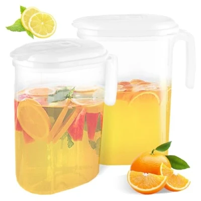 MATERIAL: The Fridge Door Jug is made of food grade material, which is strong and durable, drop resistant, BPA-Free and can service. V-SHAPED FLOW GUIDE DESIGN :The Juice Jug lid uses V-shaped flow guide to effectively prevent liquid leakage and pour out, which is more convenient to use and make usage more easier. THICK HANDLE: The fridge water jug is thick, tilted handle ensures a comfortable grip, reduces the pressure on your hand, and is easy to handle without hurting your hand. EASY TO CLEAN: The inner wall of Plastic Pitcher with Lid is smooth, and the mouth of the jar is wide, easy to clean after water flush. MULTI-PURPOSE:Refrigerator door jugs are perfect for storing all your favorite cold drinks, including water, milk and juice,can be applied for parties, gifts, birthdays, barbecues, or everyday use.
