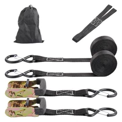 ASelected 2 PCS lashing straps with ratchet and hook for heavy loads 25 MM x 4.5 M double loops bag luggage transporter motorbike moving equipment Black