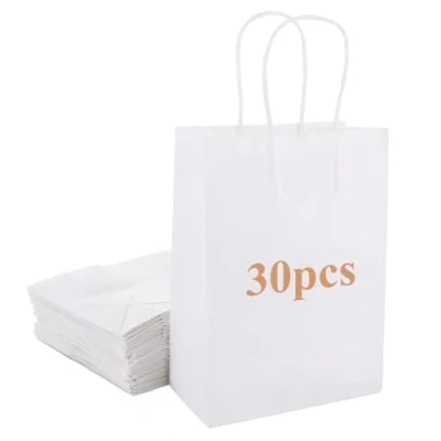 PAPER BAGS WITH HANDLES:30pcs white paper bags,size 15 x 8 x 21cm,ideal for packing small gifts,sweets,retail goods,etc DIY:Pure white paper bags,as the Gift Bags are not printed,the thick paper bags can be coloured,stamped,painted,printed,so you can leave your paintings on the paper bags MATERIAL:White paper bags are made of high quality kraft paper, thick and tear-resistant, not easy to break, reusable. Enhance the handling of the handle rope paper bag carrying handle with twisted paper design, hold firmly, easy to carry WIDELY USED:Small white paper bags are perfect to use as gift bags, candy bags, wedding gift bags, retail bags etc. Can be used for birthdays, Easter, anniversaries, etc STRONG PRACTICALITY: the bottom crease of the paper bag is flat, many times brushing glue reinforcement, so that the bottom is not easy to break, strong carrying capacity, the items will not easily fall out of the paper bag