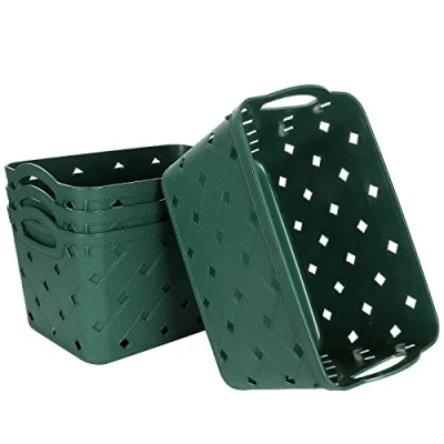 Skin Pattern Cross Woven: Beautiful and stylish appearance, the basket itself is also a suitable decoration Meet Your Storage Needs: These plastic storage basket are an easy solution to organize your home, apartment, or other living spaces. Use them to organize shelves and rooms, add to your home decor, or storage for everyday personal items. These plastic storage box can be stackable when not in use High Quality Material: Kitchen storage boxes is made of safe and odorless plastic material with woven construction, lightweight and durable to store all your need Plastic Storage Bin Size: The square storage basket size is 27.5x18.5x17.5cm, lightweight and easy to clean, just wipe clean with damp cloth Hollow Design: Weave hollow construction design is good for ventilation and dry quickly; and the hollow design allows you to easily see the items in the basket, saving time in finding items. The shelf storage container features an ergonomically designed handle which can be used to remove your basket from your cupboard safely