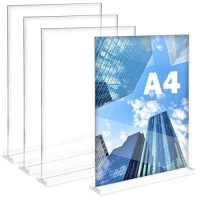 [Product Specification] A4 table stand size 210 x 297 mm, set of 4, suitable for standard A4 paper, menu pages, advertising pages [Bottom Design] This acrylic sign holder can be placed vertically, easy to use, clean and change paper. Pull out the base and put the sign paper into the sign holder to display the desired image [MATERIAL] Our acrylic sign holder is made of high quality clear acrylic, sturdy and durable, can be used for many years. Note: Please remove the protective film before use to ensure a clearer display [Sturdy T-Shape] Firmly attaches to flat surfaces such as tables and shelves, ideal for offices, restaurants, shops and trade shows [Versatile] The A4 sign holder is lightweight and portable and can be moved around. Ideal for posters, brochures, menus, offices, restaurants, hotels, parties and more