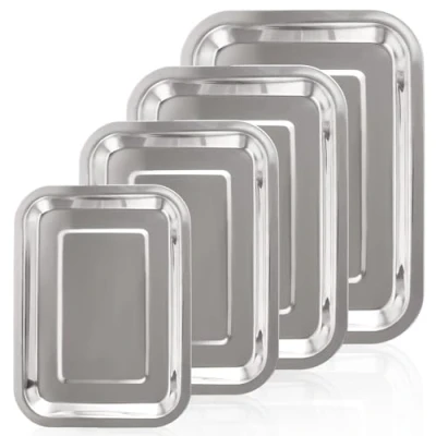 DIMENSIONS: Set of 4, Large 40 x 30x 2 cm, Medium 36x 27x 2 cm, Small 32x22x2 cm, Mini 27x 20x 2 cm, They are slim in design and cab easily be stacked to save space in your kitchen PREMIUM MATERIAL: These baking trays are not made of magnetic stainless steel, so they cannot be attracted to magnets. This usually means that they are made from high quality non-magnetic stainless steel such as 304 or 316, which have excellent corrosion and heat resistance EASY CLEAN: Deep and right-angled, these roasting trays prevent spillage to keep your oven tidy, are easy to hand wash and come out of the dishwasher looking as good as new RIM DESIGN: The rim of the baking tray is designed to be high, this design prevents food from spilling and also helps to maintain heat and moisture inside the tray during the baking process FUNCTIONAL USE: Various 4 sizes for multifunctional use and fitting most home standard ovens, Perfect for baking cooking serving cookie, bread, cake, cupcake, pizza, bacon, fish or vegatable, Also can be used in bbq, catering, picnic.Overall, this stainless steel square baking tray is a versatile and well-designed cooking tool for use in the home or commercial kitchen