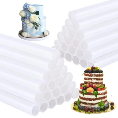 FOOD GRADE MATERIAL :Cake Dowels is made of food grade PP plastic, non-toxic, odorless, hollow interior design, safe to use, durable, reusable after cleaning, enough to support multi-layer cakes SIZE :Cake Dowels are 24 cm (9.45 in) long and 1.2 cm (0.47 in) in diameter, with a total of 50 pcs, the general size can be used directly, and the length is up to you WHAT :Cake Dowels provide a stable base for layered cakes and can also be installed on most cake separation boards EASY TO USE: Plastic White Cake Dowel Rods are very hard and strong, it is recommended to use sharp scissors, or a kitchen knife to cut the length you want, please be careful when cutting DURABLE AND SMOOTH: Cake Dowels for layered cakes have a smooth surface that can be easily inserted into the cake, and the material is thick and durable. It can support heavier cakes and is ideal for making multi-layer cakes and large size cakes