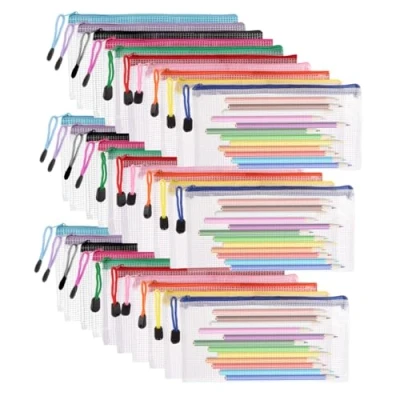PACKAGE CONTAINS:Package includes 30 pieces A6 zipper mesh pouches. 10 different colours for you to choose from, Red, Orange, Yellow, Green, Blue, Pink, Purple, Black, Sky Blue, Rose Red. Each measures about 9.3 inch x 4.7 inch,24 cm x 11 cm PREMIUM QUALITY:These A6 zip wallets are made of high-quality PVC material, which is waterproof,wear-resisting and sturdy. Collapsible and soft material not only bends or folds easily but protects your documents from damage TRANSLUCENT DESIGN:The mesh pencil case are translucent with a zipper and a practical hanging rope.ASelected pencil bags keep contents visible and make finding items so easy without opening your pencil case, which is ideal for organizing and protecting most supplies EASY TO CARRY:This zipper mesh pouch keep all of our things organized. The clear zipper pencil pouch can be used for sorting out office supplies, pens, bills, cosmetics, tickets, stationery and travel accessories.Handy zipper with nylon strip for you to hang and carry out WIDE APPLICATION:Zipper mesh pouches can be used by everyone, they are perfect for puzzles, household bills, receipts, art supplie, chargers and cables, cosmetics, toiletries, cash and sundries. Ideal for makeup essentials, school supplies, office supplies, teacher supplies, and travel accessories organization