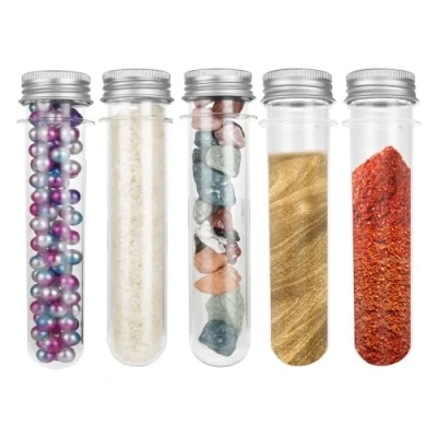 GOOD SEALING:The tube bottle is equipped with an aluminum screw cap to effectively isolate the outside air and liquid, and prevent leakage after the cap is closed HIGH QUALITY MATERIAL:aluminum screw cap, tube bottle made of PET plastic, smooth surface, transparent appearance, not easy to break, more stable than glass tub REUSABLE:Plastic test tubes are easy to clean and can be used twice after drying CAPACITY:45 ml. Size :140x 25mm, 30 pieces in total USE: Test tubes can be used as flower vases, but also can hold candy, honey, bath salt, sand and other small objects