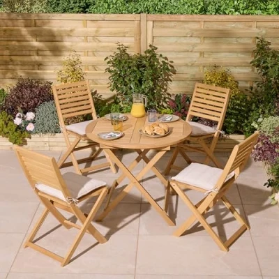 AmazonFive piece set comprising of a table and four chairs Durable Eucalyptus hardwood construction Round table, plush UV treated seat pads included - natural colour Table and chairs fold easy for easy storage, factory applied furniture oil based wood stain, all timber sustainably sourced meeting all stringent legislation Comprehensive instructions and all fittings included