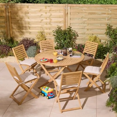 AmazonSeven piece set comprising of a table and six chairs Durable Eucalyptus hardwood construction Round table, 50mm diameter parasol hole Plush UV treated seat pads included - natural colour, table and chairs fold easy for easy storage, factory applied furniture oil based wood stain All timber sustainably sourced meeting all stringent legislation, comprehensive instructions and all fittings included
