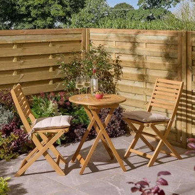 AmazonThree piece set comprising of a table and two chairs Durable Eucalyptus hardwood construction Round table, plush UV treated seat pads included - natural colour Table and chairs fold easy for easy storage, factory applied furniture oil based wood stain All timber sustainably sourced meeting all stringent legislation, comprehensive instructions and all fittings included