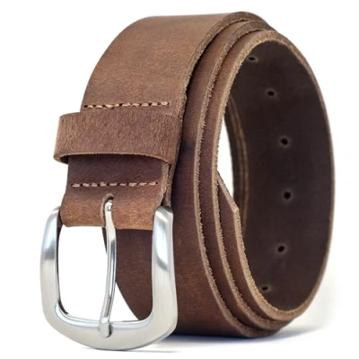 Made from 100% full grain leather. 38mm width makes it perfect for jeans or make a statement with a suit belt. Available in black, brown or tan in waist sizes from 32" to 56". Classy horse shoe style buckle providing a premium look. Because they are made from 100% full grain leather they will each have their own beautiful individual natural markings, when they arrive they will have quite a matte finish but being a natural product with a few wears the leathers natural oils will give each belt an even more stunning finish. Made by Ashford Ridge with over 40 years experience in the leather industry.
