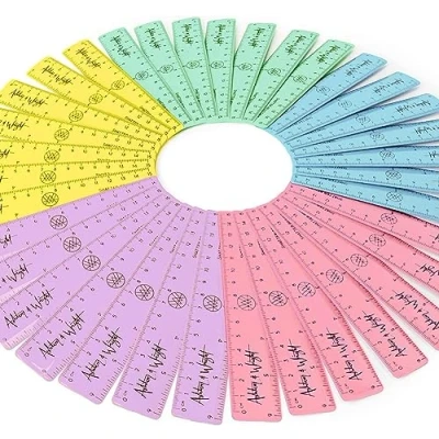Pack of 50 pastel 6"/15cm rulers from Ashton and Wright. Shows inches and centimeters on opposite sides. Each comes individually wrapped in in a thin plastic sheath. Compact size and slim design make it perfect classroom accessory, as well as use by younger children. Each pack contains fifty rulers.