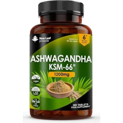 HIGH POTENCY ASHWAGANDHA KSM-66 EXTRACT - Our high strength formula contains 1200mg of ashwagandha KSM-66 root extract from a 12:1 extract. Two easy to swallow tablets per daily serving. ANCIENT ORIGIN - Ashwaganda is one of the most popular herbs in ancient practises, it has become more popular over the past few decades and it is now one of the most popular herbal supplements. VALUE SUPPLY - Each bottle contains 365 easy to swallow tablets, there are two tablets per serving (once a day) which will give you a 6 month supply. UK MADE - Proudly formulated and manufactured in the UK to the highest industry standards VEGAN FRIENDLY - Our supplement is vegan friendly, GMO & Gluten free SAFETY & QUALITY - To uphold the highest standards of safety and quality, our products undergo post-production testing for heavy metals and other unwanted compounds, ensuring full compliance with international regulations. Once testing is complete, products are bottled and packaged in BRC Grade AA certified facilities, guaranteeing that our rigorous quality standards are reliably maintained and delivered to you. Why Choose New Leaf Products? As a family-owned business with extensive experience in formulating and producing our unique range of over 100 vitamin and mineral supplements, we are dedicated to upholding the highest standards of safety and quality. We prioritise environmental sustainability and social responsibility, donating a portion of our sales to global causes. Join our community of over 2 million satisfied customers, where our customers are always our top priority.
