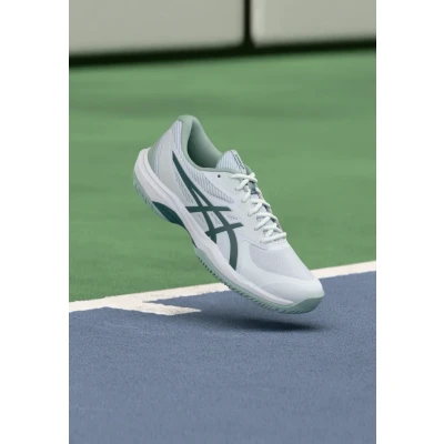 Asics GAME Multicourt tennis shoes white/dark neptune Sale at Zalando UK | Upper material: textile/synthetics/Lining: textile/Sole: abrasionproof rubber/Insole: textile | Sale order at Zalando UK! Size: 6. Color: White/dark neptune. Pattern: print.
