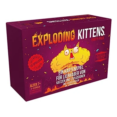 The competitive card game is a must for any lover of cats, explosions, laser beams and goats. The party pack includes the basic game and the Imploding Kittens expansion A family-friendly party game in which each player tries to defuse the exploding kitten using their cards or pulling none at all Players draw cards in turn until an exploding kitten is drawn. The corresponding player explodes instantly, dies and divorces unless he has a card to defuse Exploding Kittens is the most explosive cat game or card game ever. A tactical version of Russian roulette only with kittens instead of cartridges 2-10 players, from 7 plus years, up to 15 plus minutes playing time per game, game in German, Manufacturer: Exploding Kittens