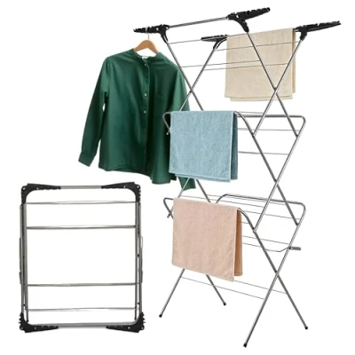 3 TIER FOLDING AIRER FOR LARGE DRYING SPACE : The stand dryer has three hanging levels with a massive 20m of drying space capacity, with 4 hanging hooks present in the drying rack for more 20 hanging space ample for drying your daily laundry, which makes it easier to organise the laundry and takes up much less space than vertical models. DURABLE & STRONG MATERIAL OF LAUNDRY STAND : This 3-tier clothes airer indoor rack is made of powered-coated steel that is rust-proof and waterproof. The clothes horse ensures strength, durability, and an elegant look in your home. Capable of holding up to 15kg approx. Worth of clothing. EASY TO ASSEMBLE DRYING RACK WITH WINGS : It opens in seconds with the double-sided auto-lock mechanism, which clicks securely into position, making it quick and easy to open. Side locks on each side of the drying rack offer added safety. It provides a reliable solution for drying clothes efficiently and maintaining a tidy home environment. INDOOR & OUTDOOR CLOTHES AIRER : Designed to fit seamlessly into contemporary living spaces, this indoor drying rack combines functionality with a sleek, portable design. Whether indoors or outdoors, it provides a reliable solution for drying clothes efficiently and maintaining a tidy home environment. VERSATILE DRYING SOLUTION FOR CLOTHES : Foldable drying rack offer room to dry your clothes, towels, bedsheets and many more items. Dry multiple different items at once, ideal for busy households, rainy days or those who do not have access to drying facilities.