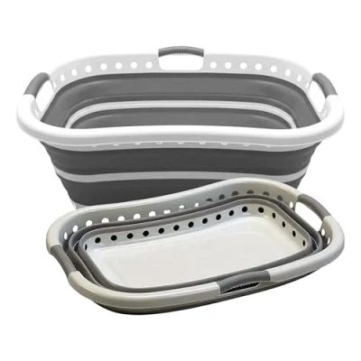 SPACE-SAVING COLLAPSIBLE DESIGN: Foldable structure allows the basket to collapse flat in seconds for compact storage in closets, under beds, shelves, or behind doors. Ideal for apartments, dorm rooms, laundry areas, and travel use. UNIQUE CURVED EDGE FOR COMFORTABLE HANDLING: The specially designed curved edge improves lifting comfort, provides a smoother grip, and reduces hand strain while carrying heavy loads, offering better usability than standard straight-edge baskets. LARGE 58L CAPACITY FOR DAILY LAUNDRY: Generous 58-liter capacity comfortably holds a full load of clothes, towels, or linens. Suitable for individual use as well as family laundry needs, reducing the number of trips to the washing area. VENTILATED BODY WITH 3 ERGONOMIC HANDLES: Airflow holes support proper ventilation to help keep clothes fresh. Equipped with three strong, non-slip ergonomic handles for balanced, secure, and convenient carrying from any direction. EASY TO CLEAN & MULTI-PURPOSE STORAGE: Smooth surface allows quick wiping with a damp cloth for hygienic use. Suitable for organizing laundry, toys, kitchen supplies, cleaning tools, outdoor accessories, or car storage. The neutral grey and white design blends easily with modern interiors.
