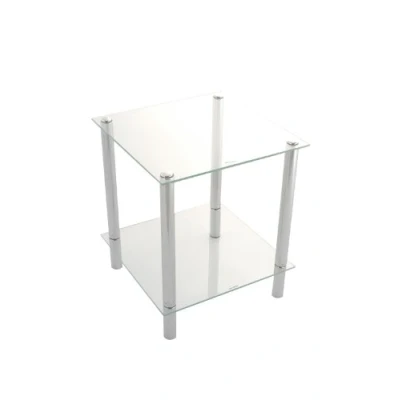 2-Tier Clear glass and chrome plated display rack. Dimensions: 39x39x47(H)cm. Ideal for livingroom,bedroom, bathrooms or to display any items Tempered glass shelves are supported by polished chrome legs. Assembly: Self assembly required