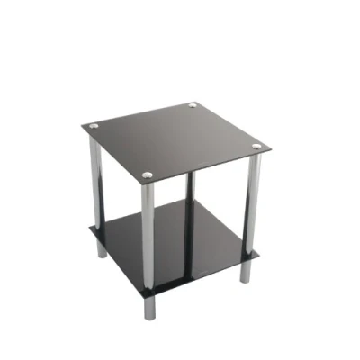 2-Tier Black glass and chrome plated display rack,side table. Dimensions: 39x39x47(H)cm. Tempered glass and chrome legs. his piece of furniture is stylish as well as practical with contrasting glass and chrome, creating an up to date look for your home. Ideal for living room,bedroom,bathrooms or to display any items.