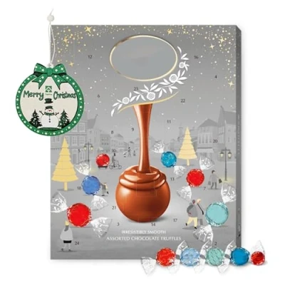 Chocolates Advent Calendar 2025 for Adults - 24 assorted chocolate truffles with a smooth melting filling. The perfect way to count down the days to Christmas. If you love chocolate, you'll love this advent calendar! Chocolate Advent Calendar 2025 with Topline Christmas Tree Decoration includes: 12 x milk chocolate truffles, 4 x milk chocolate truffles with white filling, 4 x milk chocolate truffles with coconut filling, 4 x milk chocolate truffles with caramel filling. This advent calendar is a thoughtful and sophisticated Christmas gifts choice for family, friends, or colleagues, adding sweetness and joy to their holiday celebrations. Whether you're searching for the perfect Christmas gifts for women, or a delightful Secret Santa present for men, this assorted chocolate advent calendar is a sure-fire way to spread Christmas cheer. Treat yourself or someone special to 24 days of indulgence with the ultimate way ! The Elegant Design calendar features a luxurious silver gift box, making it a standout piece under the Christmas tree or as an eye-catching table decoration. Its rich, red hues add a touch of sophistication and festive warmth to your home décor, blending seamlessly with seasonal decorations Christmas Topline Hanging Ornament – Snowman & Trees Design: crafted in a round, lightweight wooden bauble shape with a cheerful snowman and evergreen trees, it’s framed by a green border decorated with white stars and topped with a large festive bow. Dimensions: 7.9cm x 7.4cm Perfect for Christmas trees, gift embellishments or holiday décor accents Bring home the magic this Christmas with the chocolate Advent Calendar 2025. The perfect countdown until Christmas to make every festive morning taste delicious! Made of smooth-melting chocolate, all created by our Master Chocolatiers, this delicious and finest advent calendar chocolate will delight your family and friends this Christmas.