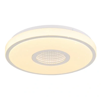 The Astania ceiling lamp brings modern chic and innovative lighting technology to your home. With a diameter of 380 mm and a unique tunnel effect in the middle area, it creates a fascinating ambience. The elegant white metal body harmonizes perfectly with the opal plastic shade, which provides a soft light. The chrome ring and mirrored 3D effects give the lamp a touch of extravagance. With an impressive light output of 1200 lumens and a pleasantly warm colour temperature of 3000 K, the Astania offers both brightness and cosiness. You can easily choose between three light levels via a tap changer: main light, 3D tunnel effect or a combination of both. The built-in memory function remembers your preferred setting and makes it easy to use. The Astania is the perfect choice for those who want to combine style and functionality! Product features: Ceiling light metal white, plastic opal sparkle, chrome ring, plastic mirrored 3d effect, step switch, memory function, ø: 380mm, h: 65mm, incl.
