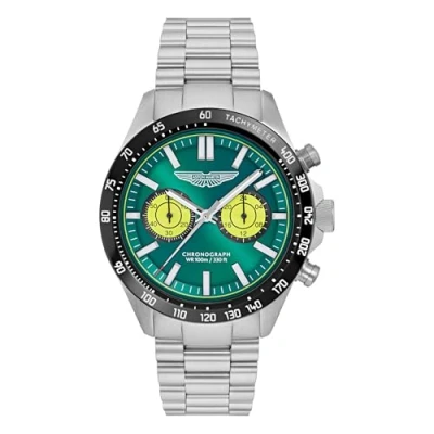 Meet SPT, a chronograph built to impress.With a bold podium green dial and contrasting subdials in Aston Martin’s lime essence hue, this version of the SPT stands out with confidence. This Chronograph watch is equipped with Stop Watch , 24-hour Display , Luminous Hands , Luminous Numbers and Tachymeter High quality Silver Stainless steel strap, measuring 21 cm in length and 22 mm in width, with a Deployment clasp Case diameter: 44 mm,case thickness: 13 mm, case colour: Silver and dial colour: Green Water resistant: 10 bars-Weight: 157 g The watch is delivered in an original gift box and has a warranty of 2 years