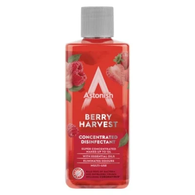 Kills Bacteria and Viruses: 3 in 1 action formula eliminates germs and bugs around the home by sanitising surfaces with this anti-bacterial disinfectant solution Multi-use: This super concentrated formula can be diluted 1:40 for use as a disinfectant, to wipe surfaces and use in a convenient spray format or use neat where strong sterilisation is required such as toilets and plug holes Lasting Fresh Scent: Banish those unpleasant odours with a beautiful fruity fragrance of berries. Also great as a refreshing deodoriser in sinks, drains and toilets Hygienically Cleans: Decontaminate your home with extremely concentrated cleaning liquid. Plus, Astonish is proud to be cruelty free and vegan friendly Easy to Use: Safe for use on most non-porous, hard surfaces. We have added surfactants so the product is also a cleaner and can be used on floors, fridges, bins, cloths, surfaces, toilets, sinks… the list is endless