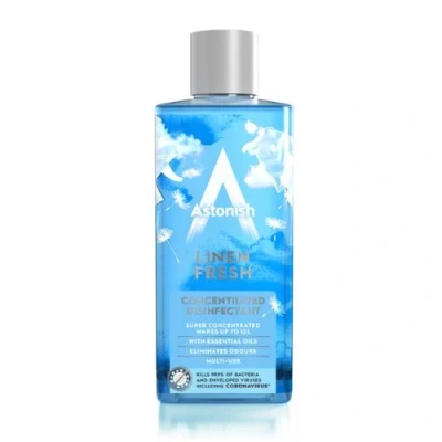Experience the refreshing scent and powerful disinfecting properties of Astonish Linen Fresh Concentrated Disinfectant! Our concentrated formula is designed to effectively eliminate germs and bacteria while leaving a long-lasting linen fresh fragrance. Keep your home clean and smelling great with Astonish.. 1 x Astonish Linen Fresh Concentrated Disinfectant 300ml. Super concentrated. Makes up to 12L. With essential oils. Eliminates odours. Multi-use. Kills 99.9% of bacteria and enveloped viruses