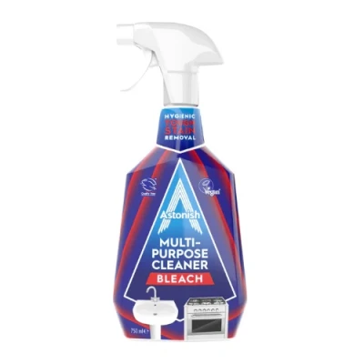 Get hygienically clean surfaces throughout your home with Astonish Multipurpose Cleaning Spray With Bleach. Ideal for tough stain removal on all areas of your home, including the bathroom and kitchen space, this spray is the perfect addition to your cleaning toolkit.. 1 x Astonish Multipurpose Cleaning Spray With Bleach 750ml. 750ml Astonish Multipurpose Cleaning Spray. Contains bleach. Vegan friendly. Packaging may vary. Assorted Packs