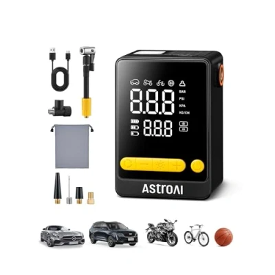 2 × FASTER INFLATION: The AstroAI L10 Mini is uniquely designed to enhance your adventures. It quickly inflates tyres (195/65 R15) from 30PSI to 36PSI in just 70 seconds, minimizing wait time and providing effortless inflation. Tackle low tyre pressure instantly, so you can enjoy hassle-free driving. 360° REVOLVING HOSE: This portable car air pump features a flexible Quick-Connect Air Hose that adapts to awkward angles while inflating, eliminating the need to resposition your vehicle. 1 S Quick Connect and prevent air leakage. Spend less time setting up and more time driving! PALM-SIZED DESIGN: This portable tyre inflator measures 10 × 6.6 × 4.6 cm and weighs less than 447 grams, fitting right in your palm. Its compact build is perfect for road trips or camping on Cars, Motorcycles, Bikes. Slide this mini tyre inflator in any car compartment, backpack, or even your pocket. Say goodbye to bulky tyre inflators—enjoy quick and easy inflation wherever you go. 5 PRESET MODES: This pump includes 5 preset modes tailored for cars, motorcycles, bicycles, balls, and a custom option. Simply press a button to preset your desired mode—making the inflation process smooth and quick. AUTO SHUTOFF & 3-MODE FLASHLIGHT: This tyre pump automatically shuts off once it reaches the preset value, preventing over-inflation for cars, motorcycles, and bicycles. In addition, its 3 flashlight modes - Strobe, Flashlight, and SOS - operate safely in dimly lit areas.