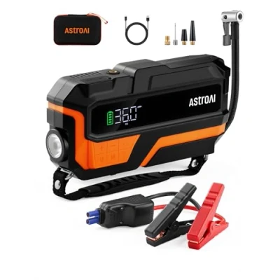 IMPRESSIVE JUMP-STARTING CAPACITY: The AstroAI M10 Jump Starter maintains reliable performance even in temperatures from -20℃ to 50℃ (-4℉ to 122℉), making it ideal for motorcycles, sedans and SUVs POWERFUL BOOST: The boost function is intended for vehicles that won’t start even after proper setup. This is often due to batteries drained from long periods of inactivity. Before pressing the Boost Button, ensure all instructions in the manual have been followed correctly for safe and effective use. RELIABLE & OPTIMAL TYRE INFLATOR: This car battery jump starter and tyre inflator combines powerful jump-starting with efficient tyre inflation. It automatically shuts off at the preset pressure, eliminating the hassle of constant monitoring, and can quickly inflate tyres from 32 PSI to 36 PSI in under 1 minute while effortlessly switching between pressure units (PSI, kPa, and Bar) 6-IN-1 MULTIFUNCTIONAL PORTABLE DESIGN: This jump pack integrates jump-starting, tyre inflation, flashlight, SOS, strobe, and power bank functions in one compact unit. Its unique carrying strap enhances portability and user-friendliness, making it perfect for road trips and outdoor adventures 10 COMPREHENSIVE PROTECTIONS: Equipped with 10 advanced safety features, including reverse polarity, overcurrent, overcharge, overdischarge, high & low temperature protection, reverse connection, overvoltage, overload, short circuit, and spark-proof protection, ensuring your safety and peace of mind CLEAR & INTUITIVE LARGE SCREEN: The easy-to-read LED screen stays clearly visible even in bright sunlight, effortlessly displaying your settings and device status SUPERIOR USER EXPERIENCE: Featuring an efficient heat dissipation system to extend service life, the device operates quietly, delivering an exceptionally comfortable experience compared to similar products COMPLETE AND PRACTICAL ACCESSORY KIT: The kit includes car battery clamps, an EVA storage case, a USB-A to USB-C charging cable, four air nozzles, a 60cm extra-long air hose, and a user manual