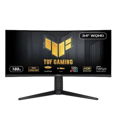 34-inch WQHD (3440 x 1440) 1500R curved gaming monitor with 180Hz refresh rate designed for professional gamers and immersive gameplay 1ms (GTG) response time for smooth gameplay, and ASUS Extreme Low Motion Blur (ELMB ) technology to further reduce ghosting and motion blur FreeSync Premium Pro delivers a seamless, tear-free gaming experience by enabling VRR (variable refresh rate) by default High Dynamic Range (HDR) technology with DisplayHDR 400 compliance supports HDR-10 format to enhance bright and dark areas 125% sRGB colour gamut delivers great contrast and colour for gaming performance