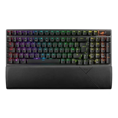 96% layout: Retains all function and number keys in a more compact and efficient layout that frees up desk space, with a form factor that is only 1 cm wider than a standard 80% keyboard Tri-mode connection: Connect using Bluetooth (up to three devices), 2.4 GHz with ROG SpeedNova wireless technology (up to 1500 hours of battery life) or wired USB Hot-swappable switches: Pre-lubed NX Snow linear switches with the walled stem design that enhances stability and prevents dust intrusion Sound-dampening foam with switch-dampening pads: Unique, integrated dampening foam with added switch-dampening pad structure absorbs pinging noises and echoes for improved keystroke acoustics Enhanced typing experience: Pre-lubed keyboard stabilizers produce less friction for smoother keystrokes and stability for longer keys; durable ROG PBT doubleshot keycaps or UV-coated ABS keycaps offer a premium feel and shine resistance* Hotkeys: F1–F5 keys are pre-programmed as hotkeys for Xbox Game Bar and recording Intuitive controls: Multi-function button and multiwheel for media playback, volume, and keyboard lighting ROG Omni Receiver: Connect to multiple supported devices wirelessly with a single receiver Unique ROG-themed space bar: UV-coated spacebar with special ROG markings and three underside RGB LEDs Ergonomic design: Three tilt positions and a detachable wrist rest