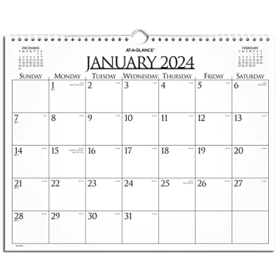 YEAR ROUND PLANNING – Keep track of deadlines and key events with an AT-A-GLANCE business wall calendar. Covers a 12 month date range from January 2024-December 2024 with Julian dates. INK BLEED RESISTANCE – Plan your schedule without fear of distracting ink bleeding. Our improved, high-quality paper is designed for superior ink bleed resistance, which keeps plans neat and legible. MONTHLY OVERVIEW – One month per page format has unruled daily for plenty of open planning space. Jot down reminders, appointments and more. Pages measure 15" x 12". Blocks measure 2" x 1-1/2" SPECIAL FEATURES - Expand your organizational skills with specialized features. The twin wire binding has a built-in wire hanging loop which makes it easy to display on the wall and keep your monthly plans in view. Full chipboard backing creates a firm writing surface. CONVENIENT FEATURES – Past/future month calendar references are displayed for easy date tracking and future planning.