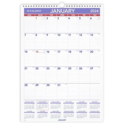 YEAR ROUND PLANNING – Keep track of deadlines and key events with an AT-A-GLANCE wall calendar. Covers a 12 month date range from January 2024-December 2024 with Julian dates. INK BLEED RESISTANCE – Plan your schedule without fear of distracting ink bleeding. Our improved, high-quality paper is designed for superior ink bleed resistance, which keeps plans neat and legible. MONTHLY OVERVIEW – Each month has ruled daily blocks to keep your handwriting neatly aligned. Spacious blocks provide plenty of writing space. Pages measure 12" x 17". Blocks measure 1-9/16" x 2-7/16" CONTEMPORARY DESIGN – Manage your time and add a stylish accent to your work area with this updated color scheme. Purple and red print pop on the white pages. SPECIAL FEATURES – Full year calendar reference on each page for quick date checking and future planning. The white twin wire at the top has a built-in hanging loop for wall display.