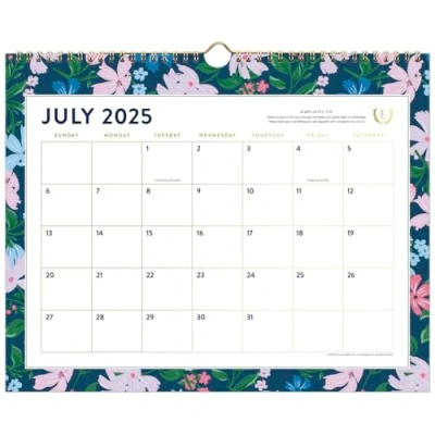 ACADEMIC PLANNING – Simplify and organize your life with this stylish Simplified Wall Calendar. Covers 12 months from July 2025 — June 2026. PETITE FLORAL DESIGN – Each page is bordered by a Petite Floral design in greens, pinks and blues. White pages are printed with navy dates and gold foil gridlines. INK BLEED RESISTANCE – Plan your schedule without fear of distracting ink bleeding. Our high-quality paper is designed for ink bleed resistance, which helps keep plans neat and legible. MONTHLY PAGES – Monthly pages feature unruled daily blocks for open planning. Weeks run Sunday – Saturday and holidays are listed. 15" x 12" page size. 1-3/4" x 1-1/2" block size HELPFUL FEATURES – Each month displays a “simplicity tip” and an extra bucket list calendar page is included to list your goals. Gold twin wire binding with built-in hanging loop for easy wall display.
