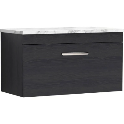 Athena Wall Hung 1 Drawer Vanity Unit with Carrera Marble Worktop 800mm Wide Charcoal Black Woodgrain Nuie