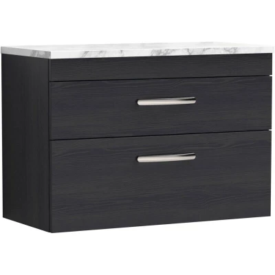 Athena Wall Hung 2 Drawer Vanity Unit with Carrera Marble Worktop 800mm Wide Charcoal Black Woodgrain Nuie