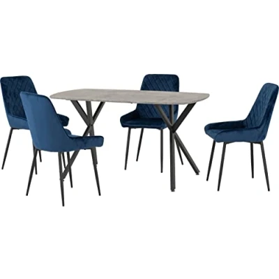 Seconique Athens Rectangular Dining Table in Concrete Effect/Black With 4 Avery Chairs in Sapphire Blue Velvet Table W 1400mm x D 800mm x H 750mm Chair W 480mm x D 590mm x H 900mm Available in other finishes This product will be shipped in several packages;They may be delivered at different times