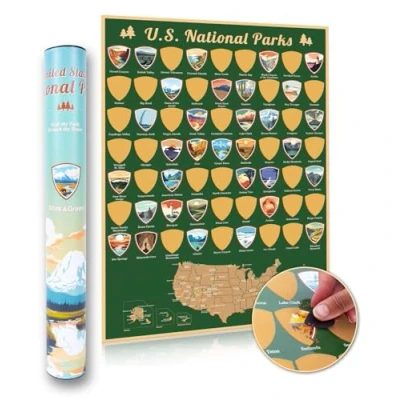 SCRATCH OFF YOUR TRAVELS: This scratch off poster has all 63 US National Parks for you to scratch off as you visit them! This national park map tracker allows you to track your travels with this the beautiful park icons and the state scratch map at the bottom STUNNING ILLUSTRATIONS: Our high quality in house illustrations captures the beauty of the parks you visit! Each badge showcases the iconic scenes from each US natural wonder FANTASTIC GIFT: The utlimate gift for travel lovers! This national parks checklist is a great gift for travelers, christmas, birthdays or any special occasion. With its quality gift tube it is ready to make someone's day LOVELY HOME DECOR: This A2 scratch poster is stylish travel decor for your home and a fantastic keep sake to mark your travel memories WHATS INCLUDED: A2 (16.5"x23.4") national parks scratch map in gift tube, scratch pick to scratch off your travels and cloth