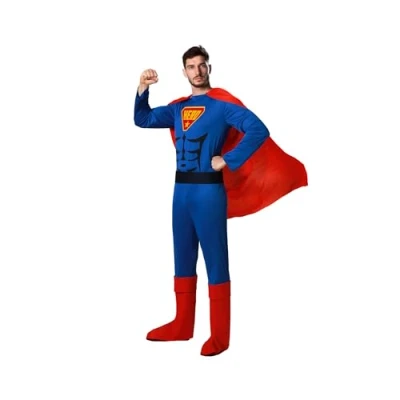 The comic hero costume is inspired by the famous superhero from comics and movies. It's an iconic suit that reflects the image of character power and bravery. The comic hero costume is tailored for a man of size XS with measurements of 90-100 cm chest circumference, 80-95 cm waist circumference and 90-105 cm hip circumference. The comic superhero costume consists of a fitted jumpsuit in bright blue with an iconic logo on the chest. Jumpsuit has long sleeves and fitted legs. The suit includes a red cape that falls back gracefully. It is long and goes to calf height. Finally, the costume is complemented by a black belt at the waist, which helps define the figure and accentuate the heroic look., Manufacturer: ATOSA