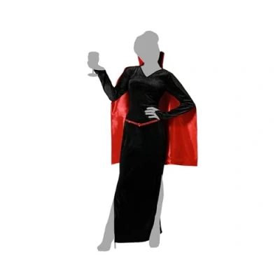 Vampire costume is a classic and popular choice for Halloween. The costume is a glamorous and sexy choice for Day of the Dead, but can also be adapted to be more creepy or scary depending on the wearer's preference. This vampire costume is made for an adult woman of size XS with measurements of 85 to 95 cm chest circumference, 70 to 80 cm waist circumference and 90 to 100 cm hip circumference. The women's vampire costume consists of a long and fitted dress with a gothic style. The color of the dress is black and dark red with a velvety texture and has details such as a V-neck, wide sleeves and a striking cloak attached with a stand-up collar. To complement the dress, elements such as long dark gloves and a choker with a red or black stone in the center are usually added to give a more sinister touch., Manufacturer: ATOSA