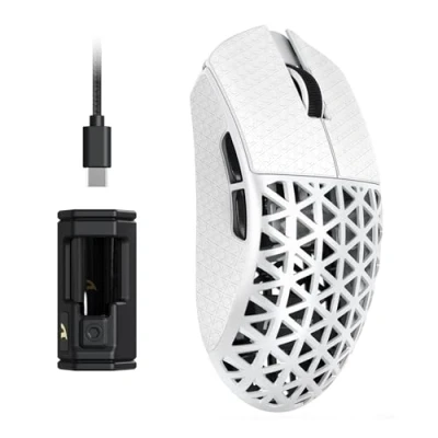 Ultra-Light Carbon Fibre Construction: ATTACK SHARK R5 Ultra made with super-tough injection-moulded carbon fibre, it's seriously light but built like a tank - resisting drops, bashes and whatever else you throw at it. The hollow design keeps it agile for those lightning-fast flicks in games like all FPS, MMO, RPG, MOBA, Battle Royale and other fast-paced games. PAW3950MAX Sensor with 8K Wireless: Equipped with the PixArt PAW3950 MAX sensor and Nordic52840 chip, via 8K wireless (custom receiver) or 1K wired mode providing zero-lag tracking and hyper-accurate for fast-paced, competitive games. Capable of 42,000 programmable DPI, 650 IPS speed, 50g acceleration, perfect for lining up head-shots or precise MMO spells. Tri-Mode Connectivity: Switch between 8K wireless (zero lag!), Bluetooth, or USB-C wired in seconds, which can be easily switched through the button on the back of the mouse. Perfectly suitable for Windows, macOS systems, etc., PCs, laptops, Mac, tablet devices. 100M Clicks & PTFE Feet: Microswitches last up to 100 million clicks, so you’ll never double-click again. The 0.2ms response time gives you the edge in rapid-fire games like Valorant. removable anti-slip grip pads and PTFE glide feet, give your mouse the most consistent slide ever, while providing better stopping power. AI-Driven Cloud Driver: No downloads required - intelligent web-based driver auto-detects devices, offering DPI adjustment, rate of return, competitive mode, customized buttons, macro recording, personalized key mapping and other advanced functions. Perfect for pros and casual gamers alike.