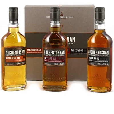 Auchentoshan Classic 20cl / 40%. Triple distilled and matured solely in American bourbon casks. The result is a Lowland Single Malt Whisky with the sweet aromas of vanilla and coconut - along with the signature smooth, delicate, Auchentoshan taste. Auchentoshan 12 Year Old 20cl / 40%. The tempting aroma of toasted almonds and caramelised toffee. Auchentoshan Three Wood 20cl / 43%. Has been matured in three different cask types. Moving from American Bourbon to Spanish Oloroso Sherry and finally Pedro Ximenez Sherry casks. Three Wood is a rich, complex whisky with incredible toffee and sherry oak flavours.