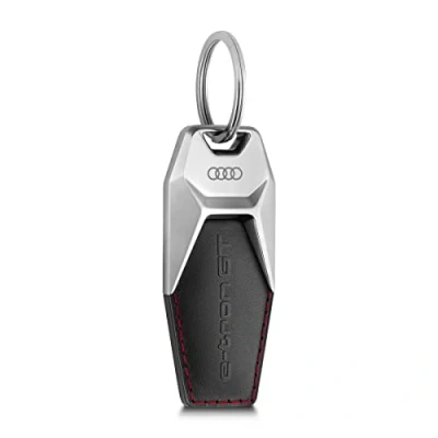Original Audi key ring in Audi design Three-dimensional metal body in combination with black cowhide leather with split ring Branding: engraving of the Audi rings logo and raised embossing of the e-tron GT logo Made in Germany Material: cowhide leather, metal, plastic | colour: black/silver/red