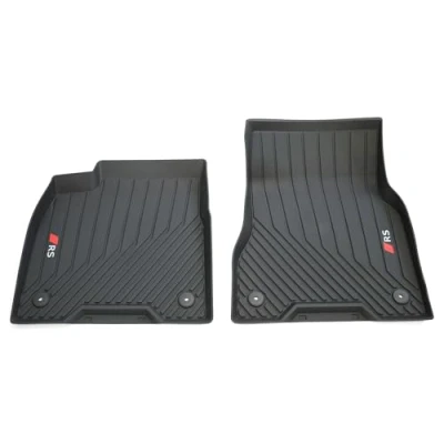 ORIGINAL ACCESSORIES: Audi Q6 e-tron RS front rubber mats, perfectly adapted to the vehicle floor dimensions. PREMIUM DESIGN: Equipped with red rhombus and RS logo in contrasting color, highlighting the sporty character. Fastening: Snap fastening system ensures a stable connection to the floor, additional nubs prevent slipping. MATERIAL: Made of high quality TPE with 20% recycled material content, wear-resistant and easy to clean. PROTECTION: Raised edges effectively protect the interior from moisture and dirt, perfect for all weather.