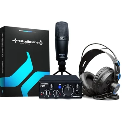 The PreSonus AudioBox GO Creator Bundle is your ultra-affordable one-stop shop for creating studio-quality recordings. PreSonus AudioBox GO USB Recording Audio Interface – Surprisingly powerful ultra-compact audio interface for portable music performance and production. Recording software included: Studio One 6 Artist Edition PreSonus M7 Microphone & Mic Accessories – Versatile cardioid condenser microphone with built-in windscreen plus mic stand adapter, 10-foot XLR cable, and mic pouch. PreSonus HD7 Professional Monitoring Headphones – Ergonomic high-definition headphones