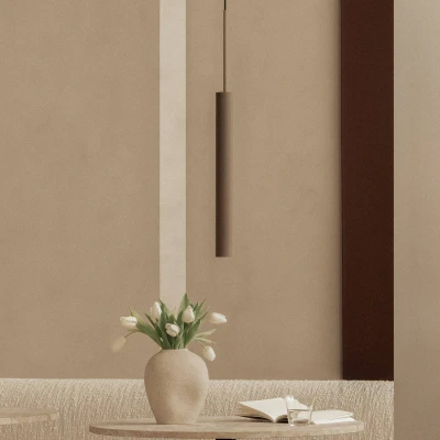 Lights.coTubulaire pendant light with a slim cylindrical shade in anodised bronze finish The Tubulaire pendant light impresses with its elegant, timeless design, not only in private living spaces, but also in prestigious business, office and lounge areas. A cylindrical lampshade hangs from a round canopy on a textile cable, with a GU10 bulb at the bottom. The lampshade is made of aluminium, which is extruded to give it a linear structure. Finally, the material is anodised in bronze. The Tubulaire series of lights is produced by the Danish brand Audo Copenhagen. The design is by Krøyer-Sætter-Lassen, a furniture design and interior design studio founded in 2016.
