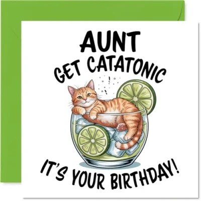 MAKE YOUR AUNT SMILE WITH THIS UNIQUE BIRTHDAY CARD: This exceptional quality Aunt birthday card shows the design ''Aunt Get Catatonic Its your Birthday''. If you are looking for an awesome birthday card for Aunt, then then this happy birthday Aunt card is bound to make them smile. Not just a birthday card for Aunt this could also be a birthday gifts for Aunt, Aunty or Auntie. WHAT DO YOU GET: The card is printed on one side and BLANK ON THE INSIDE to allow you to write your very own message. The unique fun design is printed on a specially sourced and environmentally responsible board. At 360 microns thick the natural white one-sided gloss board has a quality look and feel. Supplied with a coloured gummed envelope to complement the design and ready to be sealed and sent in the post. Great Aunt birthday cards, Aunty birthday card. NO INK SMUDGES: There is nothing worse than writing inside a card to find that the shiny surface makes the ink smudge. This is why we use a high quality one sided coated board. The uncoated side will absorb more of the ink from your pen to make smudging a thing of the past. Aunt birthday cards, Aunt birthday cards from Nephew. SIZES: Greeting Card = 145mm x 145mm, Envelope = 155mm x 155mm, Card Thickness = 360 micron. Happy birthday Aunt, Aunts birthday card, Aunt cards birthday, birthday card Aunt, happy birthday Aunt card, Aunt gifts from Nephew. MADE AND QUALITY CHECKED IN THE UK: We print and manufacture all our products right here in the UK so you can be sure of a fast turnaround and a product that is expertly made. Using environmentally responsible premium board our card is conscious of the responsible management of the world''s forests - happy birthday card Aunt, Aunt birthday cards.